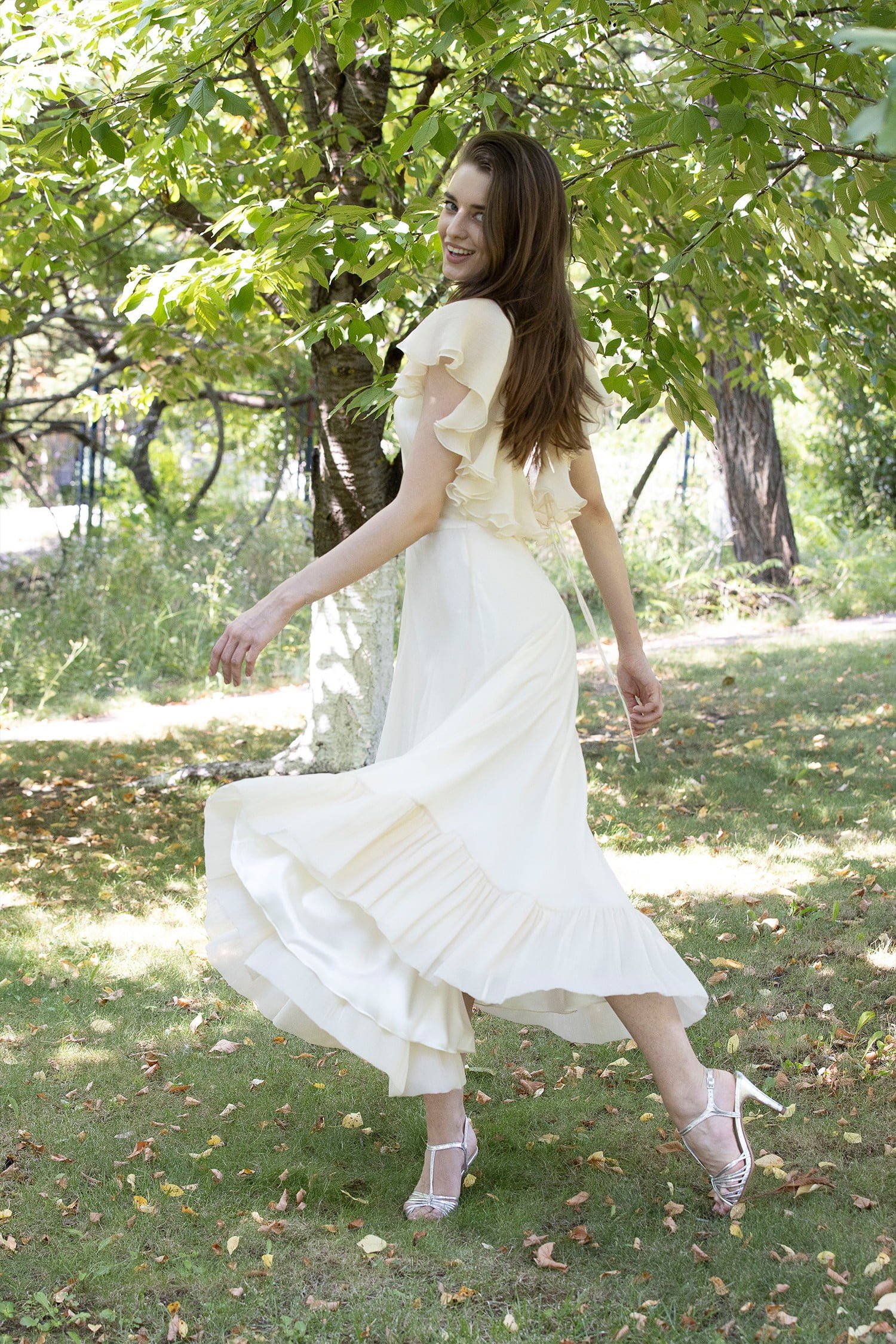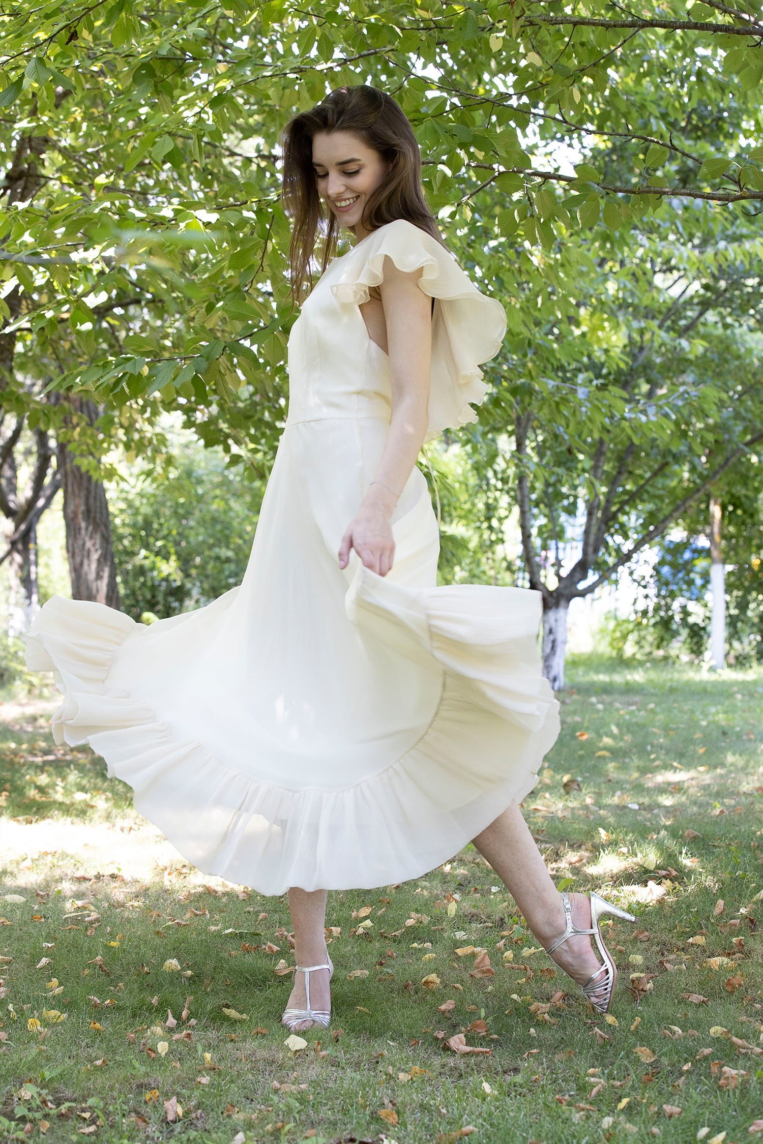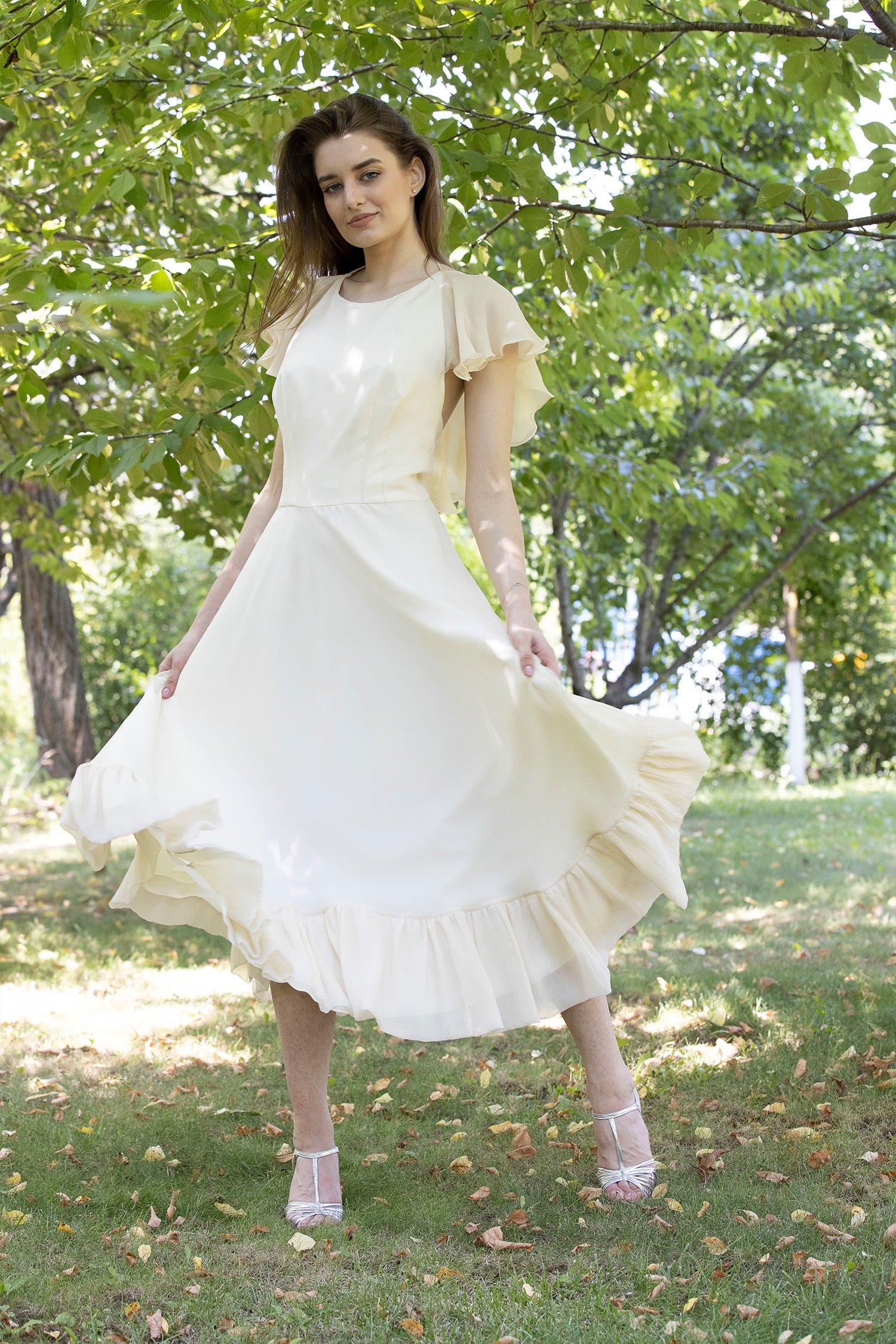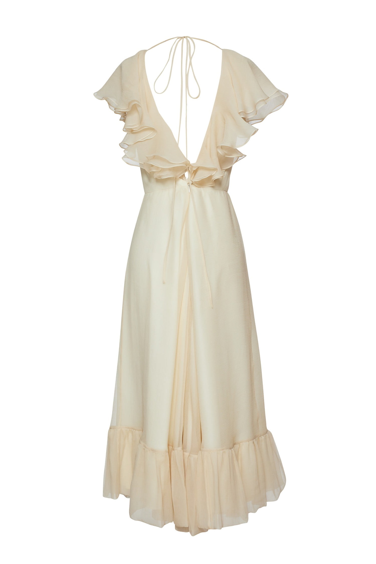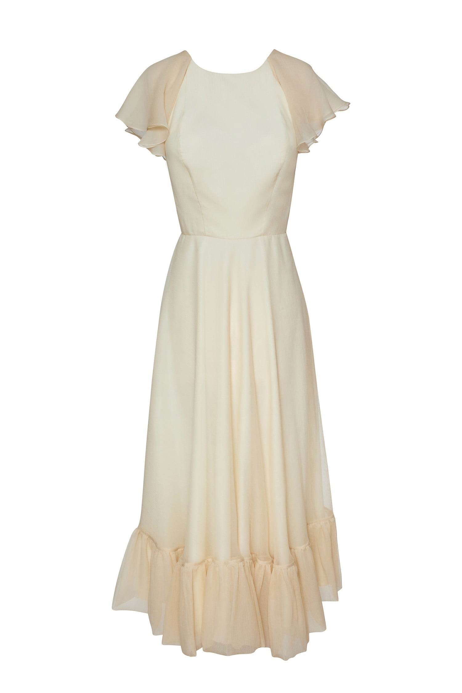 Dawn dress is decorated with ruffles on the sleeve line and an open back.
